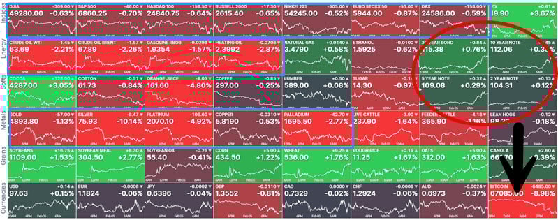 And now, we have what appears to be another set of liquidity troubles here on February 5th. Equities are getting sold, oil and gas are getting clobbered, the metals are being sold hard, and Bitcoin is getting clobbered, too. But bonds are barely reacting, which would ordinarily be climbing in price if this were a typical market sell-off. But they are not.