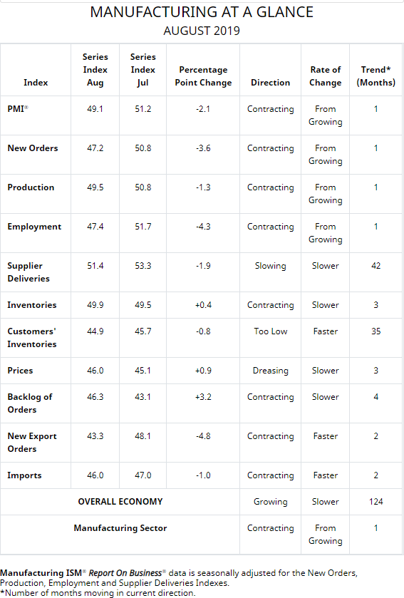 "The August PMI® registered 49.1 percent, a decrease of 2.1 percentage points from the July reading of 51.2 percent. The New Orders Index registered 47.2 percent, a decrease of 3.6 percentage points from the July reading of 50.8 percent. The Production Index registered 49.5 percent, a 1.3-percentage point decrease compared to the July reading of 50.8 percent. The Employment Index registered 47.4 percent, a decrease of 4.3 percentage points from the July reading of 51.7 percent. The Supplier Deliveries Index registered 51.4 percent, a 1.9-percentage point decrease from the July reading of 53.3 percent. The Inventories Index registered 49.9 percent, an increase of 0.4 percentage point from the July reading of 49.5 percent. The Prices Index registered 46 percent, a 0.9-percentage point increase from the July reading of 45.1 percent."