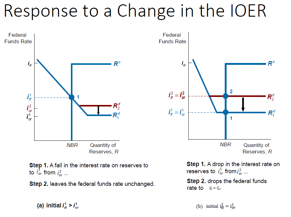 In theory, though, lowering the IoER does not lower the Fed funds rate. To see this, consider a graphic pulled from a money & banking textbook (Mishkin), and edited.
