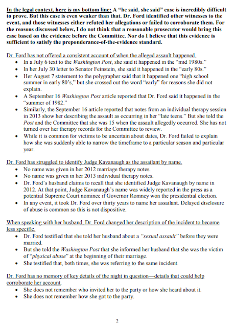 So far, the following summation from Ms. Mitchell is before the Senate for their consideration with regard to Ms. Ford's accusations that she made against Judge Kavanaugh in her public testimony in the Senate Judiciary Committee hearing last week (September 27).