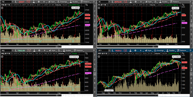 The forward-looking (offset into the future) set of moving averages shown on the following daily charts of the four E-mini Futures Indices are known as an alligator formation, which represents a technical chaos zone. As of 1:10 pm ET, the YM has descended into (and is at the bottom edge) of this chaos zone, and the ES, NQ and RTY have descended below the chaos zone.