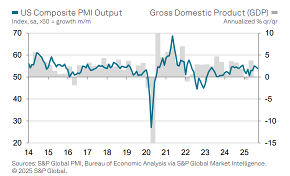US economic activity eased in Septmeber, according to the US Composite PMI, a survey-based GDP proxy. The current reading is moderately above the neutral 50 mark that separates growth from contraction.