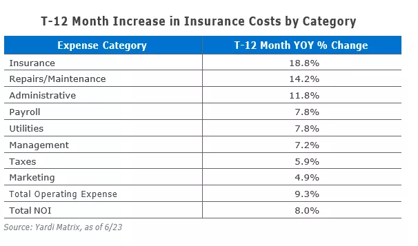 Expenses rose in almost every category, but the biggest increase was in insurance, which was up 18.8% on average in the 12 months ending in June 2023, per Matrix. Other expense categories with large jumps over the last year include repairs and maintenance (14.2%), administrative (11.8%), and utilities and payroll (both 7.8%). Perhaps surprisingly, taxes increased by only 5.9%. The increase in expenses in the period ending in June 2023 represents $740 in additional costs per unit at the average U.S. multifamily property, with the average property operating expense rising to $8,694 per year per unit, according to Matrix.