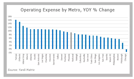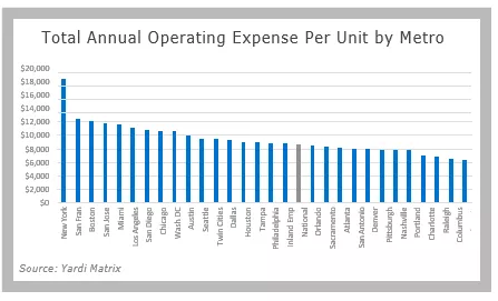 Metros with the lowest per-unit expenses are Greenville, N.C. ($4,988); Little Rock, Ark. ($4,971); and Northwest Arkansas ($4,518). Among the top 30 metros, Columbus ($6,574), Phoenix ($6,376), and Las Vegas ($6,136) have the lowest expenses.