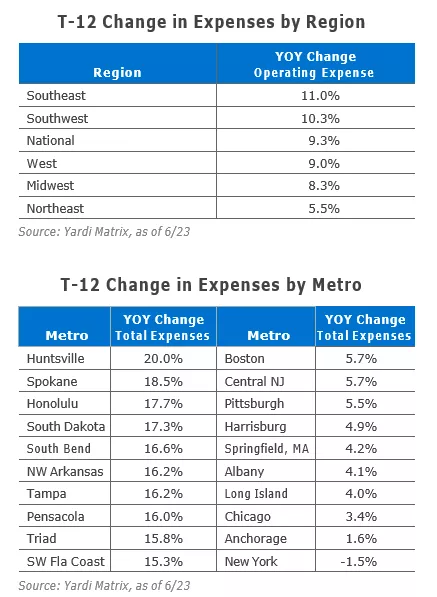 As in the regional numbers, metros with large year-over-year increases in expenses per unit tend to have lower overall expenses than large coastal metros where recent increases were smaller. For example, expenses average $9,024 per unit in Tampa, less than half of the $18,484 per unit in New York City, where expenses fell by 1.5% year-over-year through June 2023.