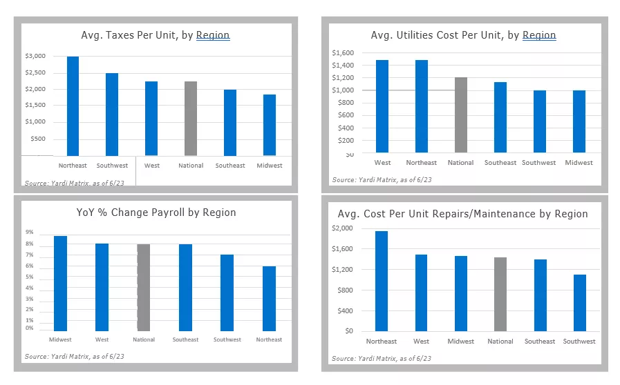 Regional multifamily expense growth reflected national inflation trends, as costs rose the most in rapid-growth regions, led by the Southeast (11.0%) and Southwest (10.3%). Expenses grew less rapidly in the West (9.0%), the Midwest (8.3%), and the Northeast (5.5%). Despite the increase, expenses remain lower in the regions with the highest year-over-year growth. Properties in the Northeast have the highest expenses per unit at $11,251, followed by the West ($9,325), Southwest ($8,144), Southeast ($8,141), and Midwest ($7,635).