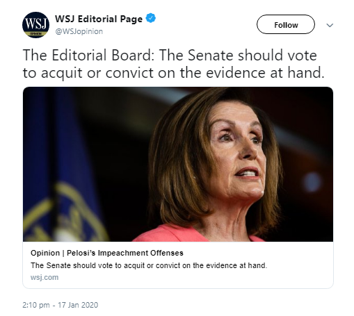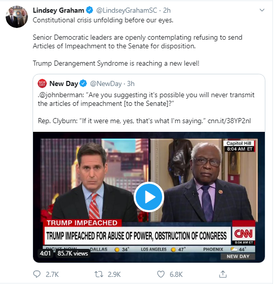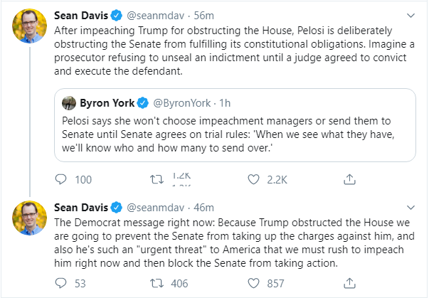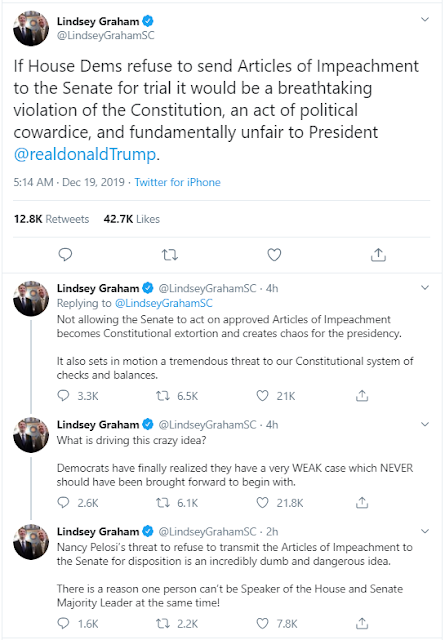 Democrat House Speaker Nancy Pelosi is now threatening to hold off sending their Articles of Impeachment to the Senate because she wants to first approve their trial process. I believe that is unconstitutional, based on what I'm reading. Besides, the Senate did not have the right to tell the House how to conduct its impeachment hearings, so why does she think she has such a right!