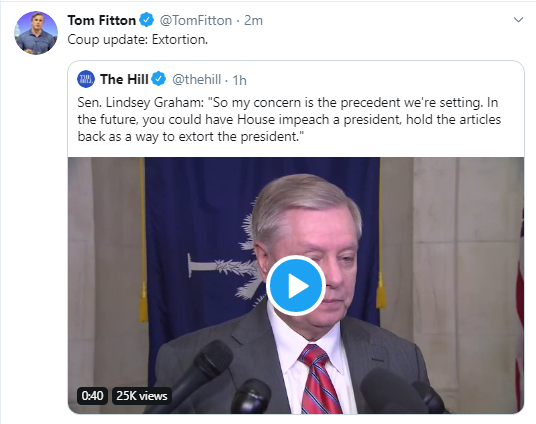 In other words, the House has dealt its hand (the formal Impeachment document) and the Senate should play their own hand in dealing with it by simply considering the "Four Corners of the Document"...just like Special Counsel Robert Mueller did in his testimony before Congress when he defended his report on Trump-Russia collusion last year.