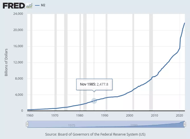 The first so-called stimulus bill of the Covid era passed on March 27, 2020—right around the inflection point on the money supply graph. It was $2.2 trillion. The second passed on December 21, 2020 for $900 billion of so-called stimulus spending on top of the omnibus spending bill. The third so-called stimulus bill, this one dubbed the American Rescue Plan Act, passed on March 10, 2021 and was $1.9 trillion, making it a total of $5 trillion of so-called stimulus spending. This is on top of the original spending trajectory. Since we are still on the napkin, we can approximate on the money supply graph: it is currently $22 trillion, while extending the pre-inflection path would have it somewhere around $17 trillion. Thus, the money supply increased above its previous path by roughly the amount of the three so-called stimulus bills ($22T - $17T = $5T).