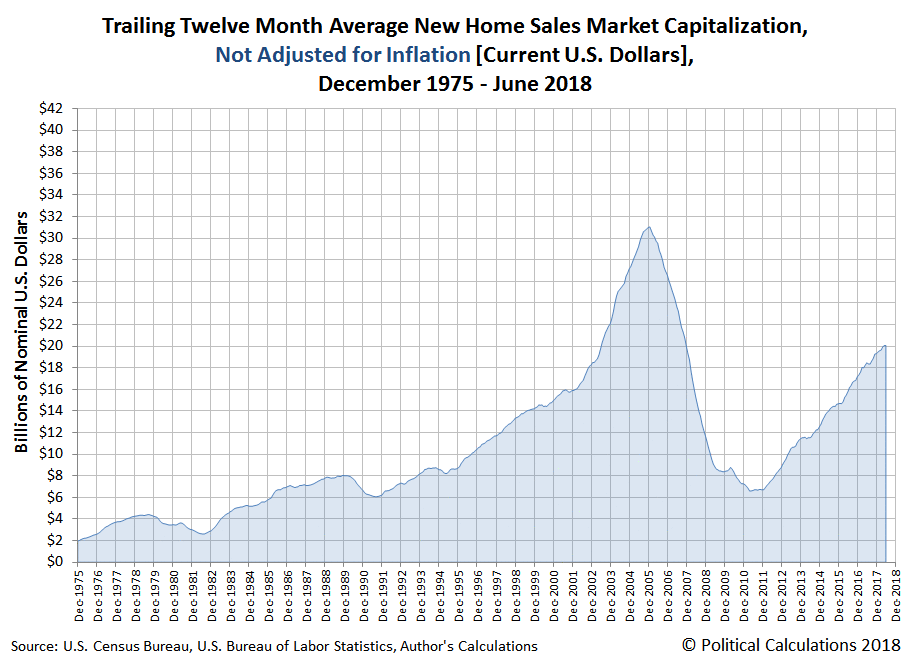 Roughly every three months, we check in on the overall state of the new home market in the U.S. by estimating its market capitalization, where we take the average prices of new homes sold in the U.S. and multiply it by the number of new homes sold each month, then calculating its twelve month average to minimize the effects of seasonal variation in the monthly data. The following animated chart shows the results of that math, both in nominal terms and adjusted for inflation, for the period from December 1975 through the preliminary data just reported for June 2018.