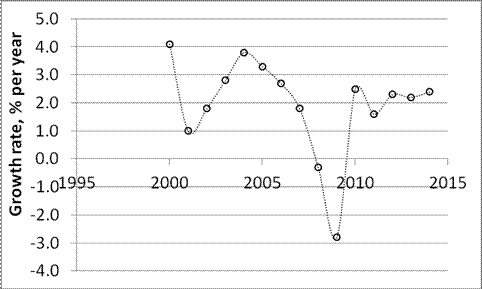 The Bureau of Economic Analysis reports that real GDP in the USA has been growing at almost the same rate since 2010 - around 2.2 % per year. In 2014, the rate of growth was 2.4% per year slightly above the 2013 value of 2.2% per year. Figure 1 illustrates the history (recession in 2008 and 2009). By all means this is a mediocre growth rate. It's even worse when real GDP per capita is considered - the growth in 2014 was smaller than that in 2013 - 1.8% vs 2.4% per year, respectively. The economy is slowing down. Some optimists expected healthy growth. Not in the next ten years.