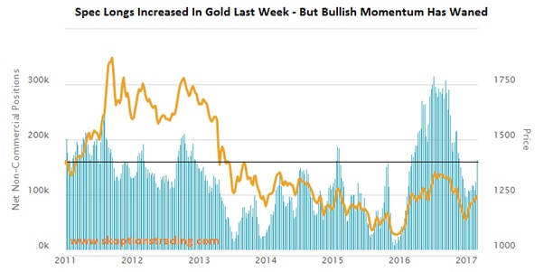 The price action in miners this week exposed just how long the market is in this sector. Speculative money has flooded back into miners after their speculator rise. At the end of January we wrote an article entitled “ Gold Mining Stocks Could Halve In 2017” and the sheer volume of negative feedback we received following this made the positioning glaringly obvious. Since then GDX is down -4.1%.