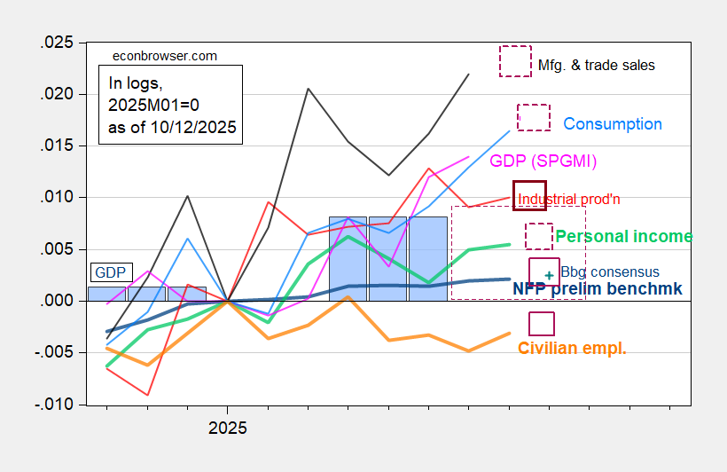 Figure 1: Implied NFP preliminary benchmark revision (bold blue), civilian employment with smoothed population controls (bold orange), industrial production (red), Bloomberg consensus employment for implied preliminary benchmark, (blue +), personal income excluding current transfers in Ch.2017$ (bold light green), manufacturing and trade sales in Ch.2017$ (black), consumption in Ch.2017$ (light blue), and monthly GDP in Ch.2017$ (pink), GDP (blue bars), all log normalized to 2025M01=0. Purple squares denote releases already missed. Purple dashed squares indicate releases that will be missed and/or delayed with a 31 day shutdown. Source: BLS via FRED, Federal Reserve, BEA 2025Q3 third release, S&P Global Market Insights (nee Macroeconomic Advisers, IHS Markit) (9/2/2025 release), and author’s calculations.