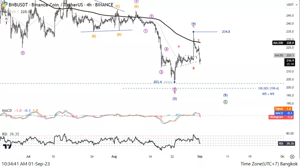 Binance/U.S. dollar(BNBUSD)Technical Indicators: The price is below the MA200 indicating a downtrend, MACD and RSI bearish momentum.