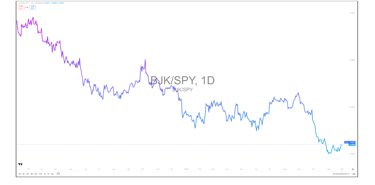 I don't gamble personally. I like my odds better as a trader. But I can't ignore what's happening in this space. Check out this chart of the gaming sector (BJK) versus the S&P 500. After years of underperformance, we're finally seeing relative strength creep back into these names.