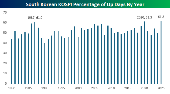 The gains in the KOSPI have also been consistent. Through last night’s close, the index traded higher on nearly 62% of all trading days, putting it on pace for the highest percentage of up days in a year on record. The only two other years when up days exceeded 60% were 1987 (61.0%) and 2020 (61.3%).