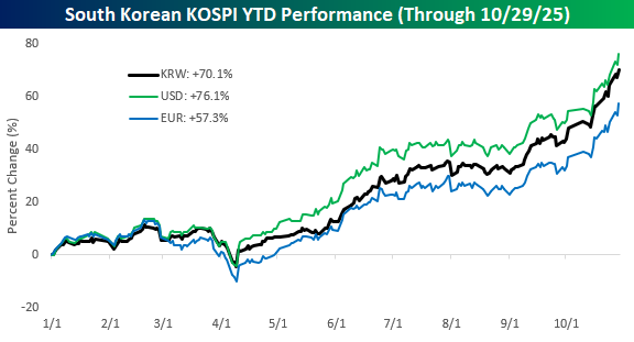 With Asian stocks mostly higher overnight, South Korea, after announcing a trade deal with the US, saw the KOSPI rally 1.8% to another in what has been a string of recent record highs. For the year, the KOSPI has now rallied more than 70%, which pretty much outdoes every other major stock market around the world on a YTD basis. Not only has the KOSPI rallied, but with its currency rallying against the dollar this year, from the perspective of a US investor, the gains are even greater at 76.1%. Even in euro terms, South Korean stocks are up over 57%!