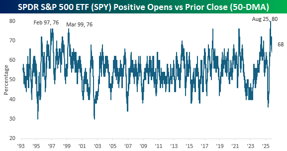 Much of the strength in SPY at the opening bell has come more recently since the tariff-tantrum. Over the last 50 trading days, SPY has gapped up at the open on more than two-thirds of trading days, and back in August, that percentage spiked up to a record high of 80%, exceeding the twin peaks of 76% from February 1997 and March 1999. What makes the current spike even more unique is the fact that it immediately followed a period of extreme selling at the open. Just as recently as this Spring, SPY gapped down on nearly two-thirds of all trading days, which was the lowest reading since December 2006.