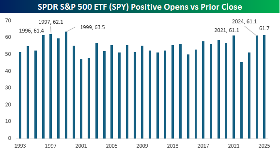 In the US, where we’ve seen strength this year has been at the opening bell. Just like today, the SPDR S&P 500 ETF (SPY) has gapped up at the open on 61.7% of all trading days. Since its inception, the only years with a higher percentage of positive gaps were 1999 (63.5%) and 1997 (62.1%), while 1996, 2021, and 2024 were the only three other years when SPY gapped up at the open more than 60% of the time.