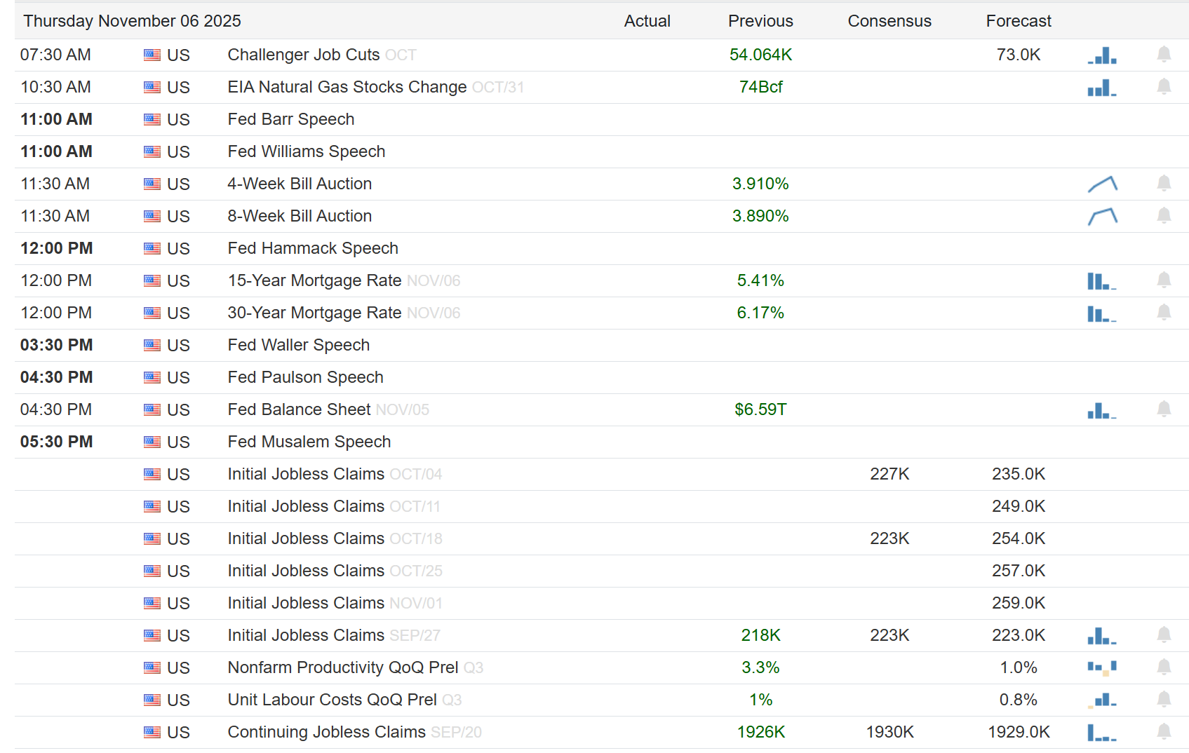 The graph below compares the recent performance of Bitcoin, Mega Cap Growth (MGK), and the Equal Weight S&P 500 (RSP). As it shows, Mega Cap stocks continue to trend higher, up almost 50% since the Liberation Day trough. Bitcoin accelerated even faster from the April lows, rising 60% in early October. However, over the past month, Bitcoin and other cryptocurrencies have fallen sharply, giving up about half of the April-to-October gains. It now stands about 20% below MGK since April. For context, we show RSP representing all of the stock sectors and factors that have been lagging. While its 19% gain since April is nice, its underperformance is striking.