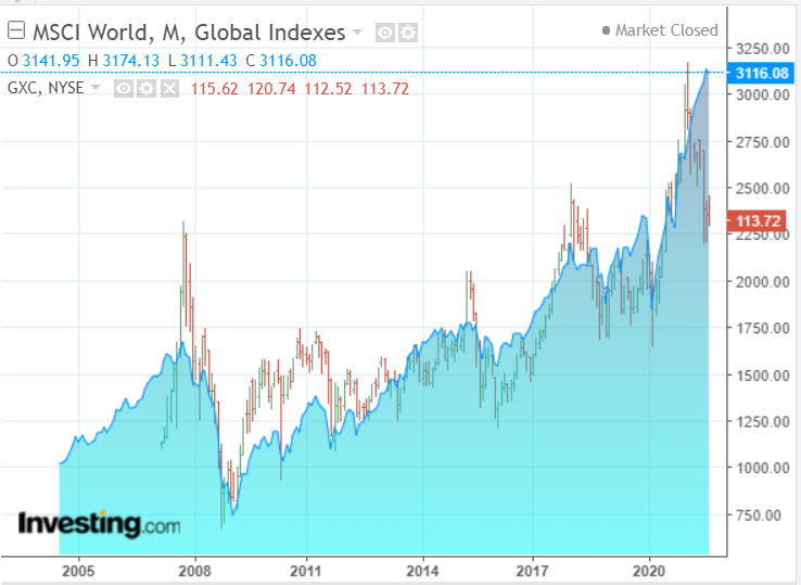 They should signal how much of an impact or contagion may spread from the Evergrande debts and defaults to the banking sectors and investors around the globe...and how such contagion may impact the global equity markets...e.g., track the price action of the MSCI World Index and the GXC for a big-picture view, as shown on the following monthly comparison chart.