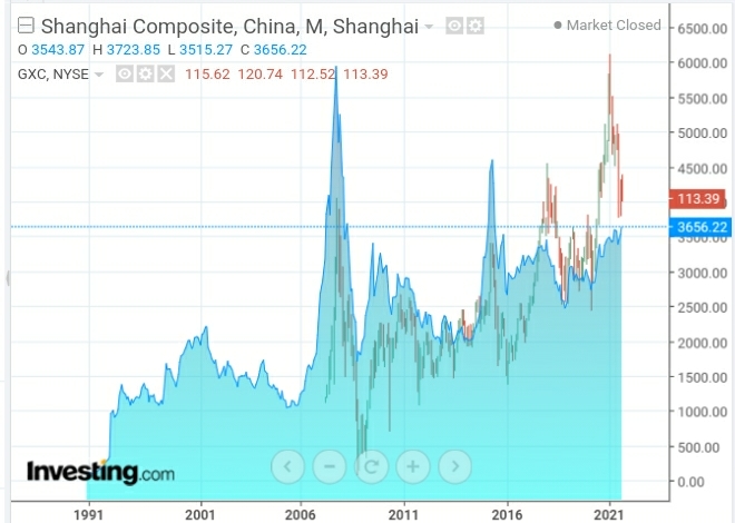 The following monthly comparison chart of the SSEC and GXC shows that they have, historically, moved in lock-step. However, note the huge divergence that has occurred since February 2021.