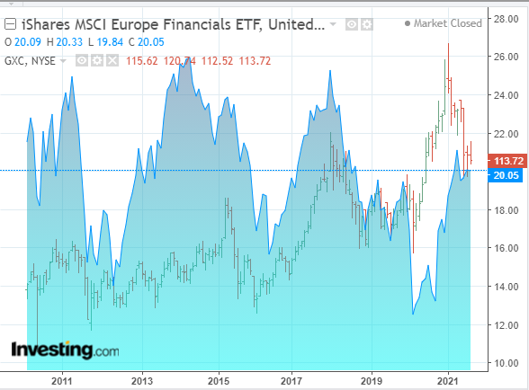 The following monthly comparison chart shows that Europe's Financial ETF, EUFN, has pulled back a bit from this year's high, while China's GXC has plunged.