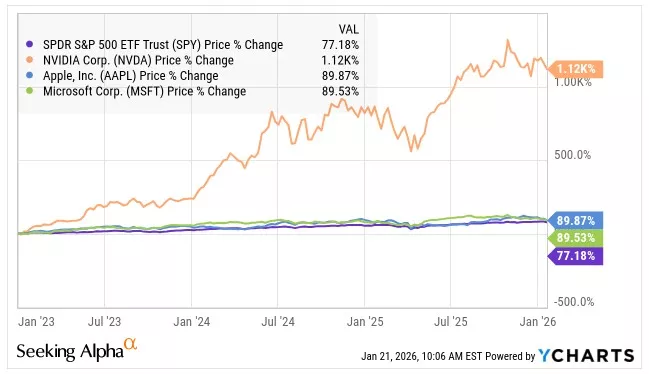 Going back to the end of 2022, SPY has rallied in price by 77.2%, and each of these three mega-cap names has done better, especially NVDA: