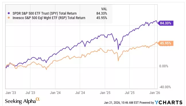 RSP should ultimately track SPY well, but it has lagged badly in recent years. Here is the perspective since the end of 2022: