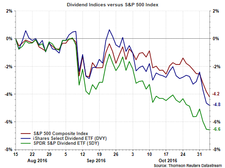 Lastly, investors have the ability to purchase ETFs focused on dividend paying stocks. These index type investments are also underperforming the broader market since the S&P 500 Index high in August.