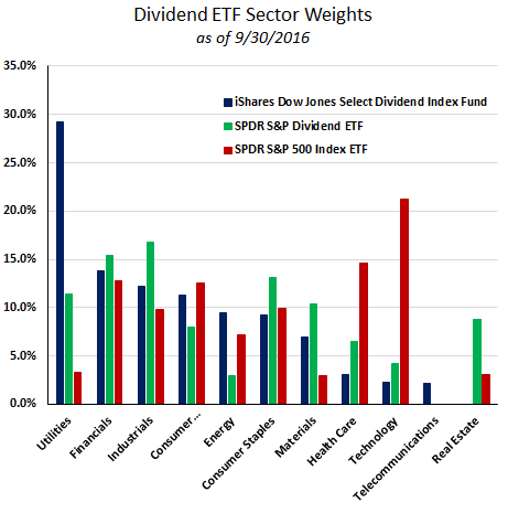 As an aside, and an important one, investors interested in these dividend focused products should do their homework in terms of understanding the composition of the ETFs. One important factor investors should be aware of is the varying sector composition between the various ETFs. Below is the sector breakdown of SDY and DVY, along with the S&P 500 Index ETF (SPY). As can be seen, DVY has a high allocation to utility stocks, which has served it well year to date; however, recent weakness in utilities, and maybe more weakness ahead, could be a headwind for DVY's performance.