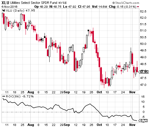 The consequence of this chase for yield is many of the dividend paying stocks trade at valuations (P/Es) that are above where they historically trade. Additionally, the P/E divided by the earnings growth rate, or PEG, has also risen to elevated levels as noted in the above chart. A perfect case in point is the utility sector. The S&P 500 utility sector P/E is 17 while 2017 calendar year earnings are expected to grow only 1.2% resulting in a PEG of 14. Because these yield-like stocks tend to trade like bonds, as interest rates are increased, the price moves in the opposite direction or down. In the first chart above, the utility sector has been a strong performing one in 2016. Even since August, the sector has outperformed the S&P 500 Index. Timing can be everything and as the below chart shows, investors that bought utility stocks in early July though may be down nearly 9%.
