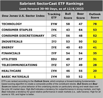 Our rules-based Sector Rotation model, which appropriately weights Outlook, Bull, and Bear scores in accordance with the overall market’s prevailing trend (bullish, neutral, or defensive), switched from neutral to a bullish bias in early November and remains so. The model suggests holding Technology (IYW), Consumer Discretionary (IYC), and Telecom (IYZ), in that order, although Industrials (IYJ) is close as well. (Note: In this model, we consider the bias to be bullish from a rules-based trend-following standpoint when SPY is above both its 50-day and 200-day simple moving averages, but neutral if it is between those SMAs while searching for direction, and defensive if below both SMAs.)