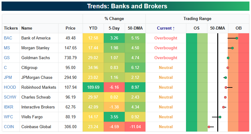 One other area of the market worth looking at is the banks and brokerage firms. While Bank of America (BAC) is up the least year-to-date of any of the stocks shown, it's up the most over the last week with a gain of 3.3%. BAC is also now the most overbought stock of the bunch as it trades nearly two standard deviations above its 50-day moving average. On the flipside, Coinbase's (COIN) 4.6% drop over the last week leaves it as the only name in the group that's below its 50-DMA.