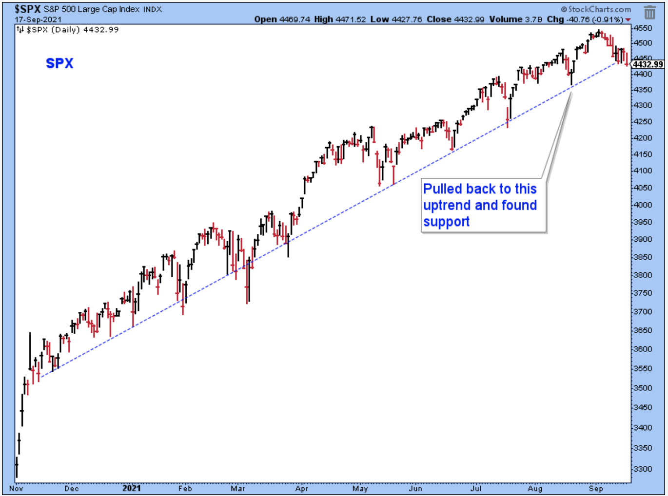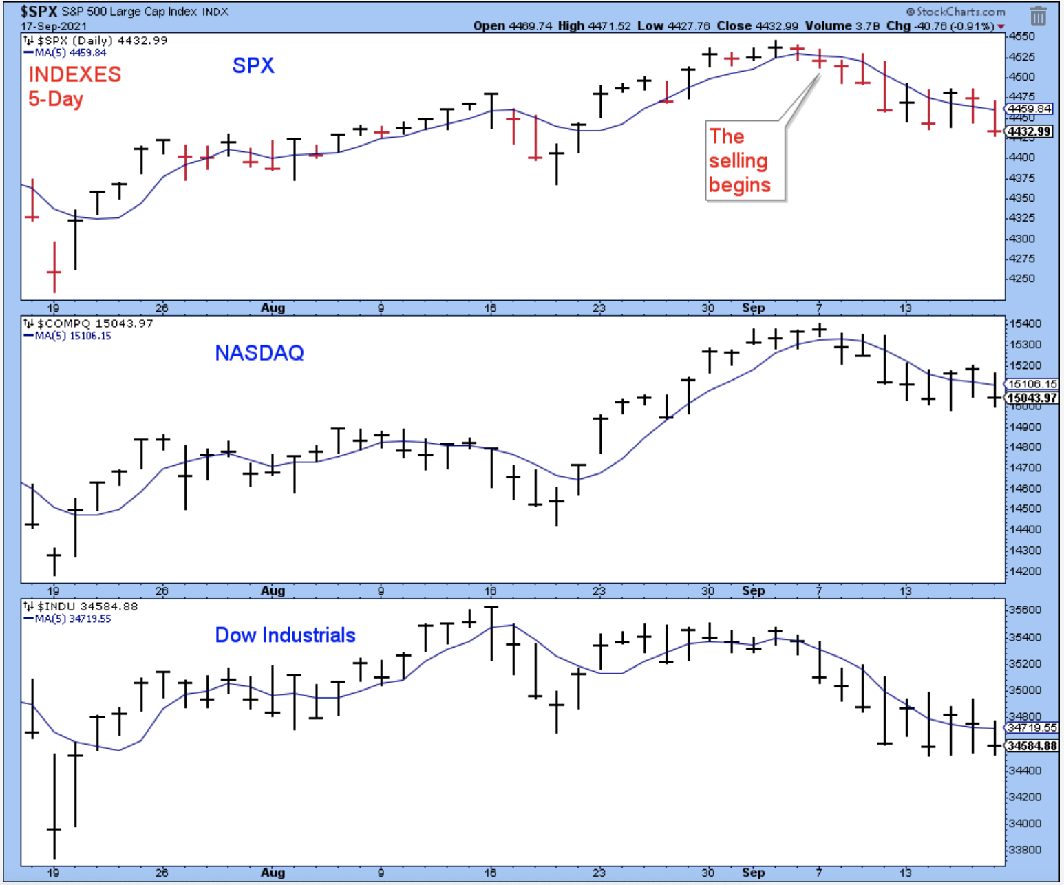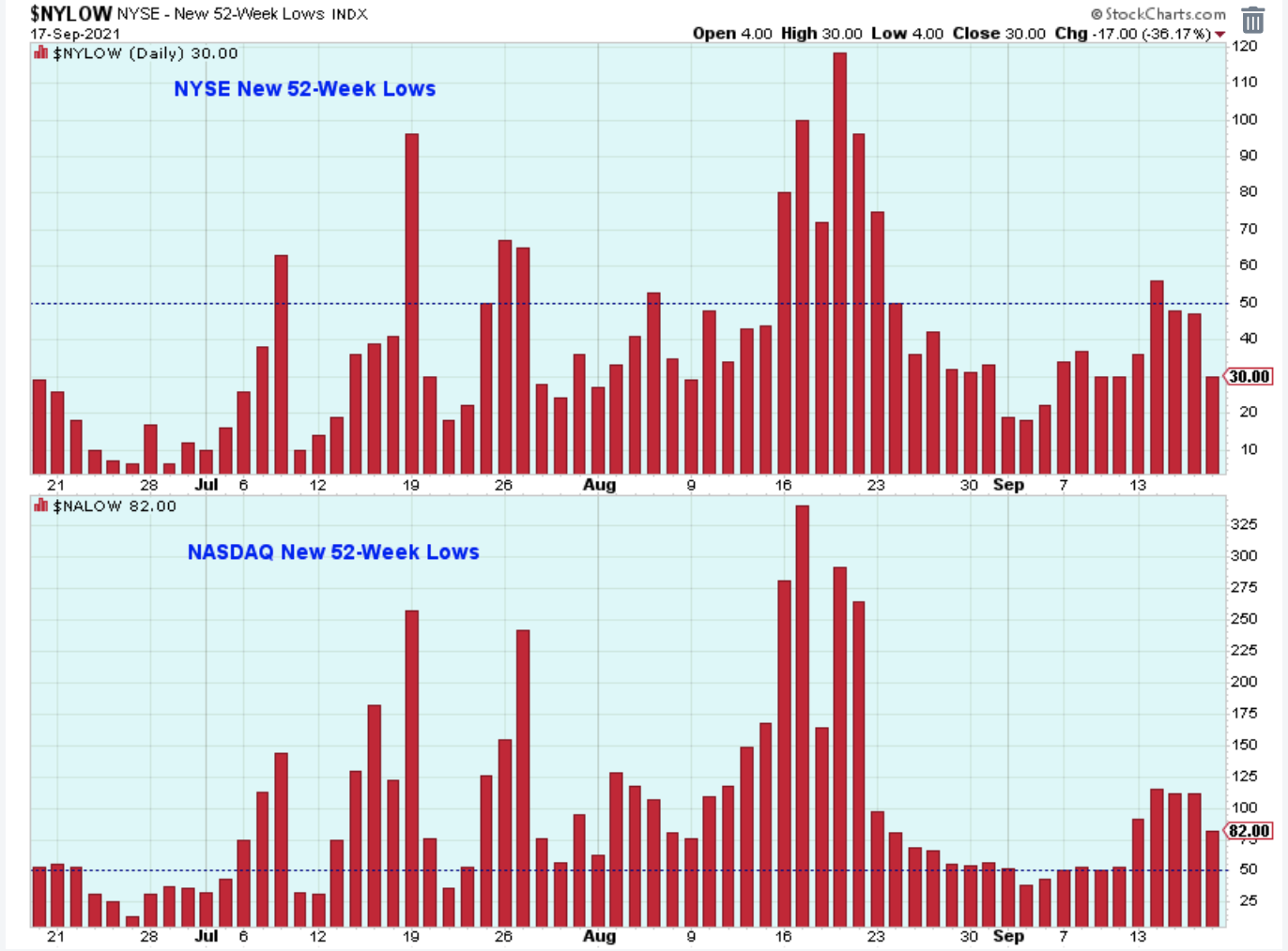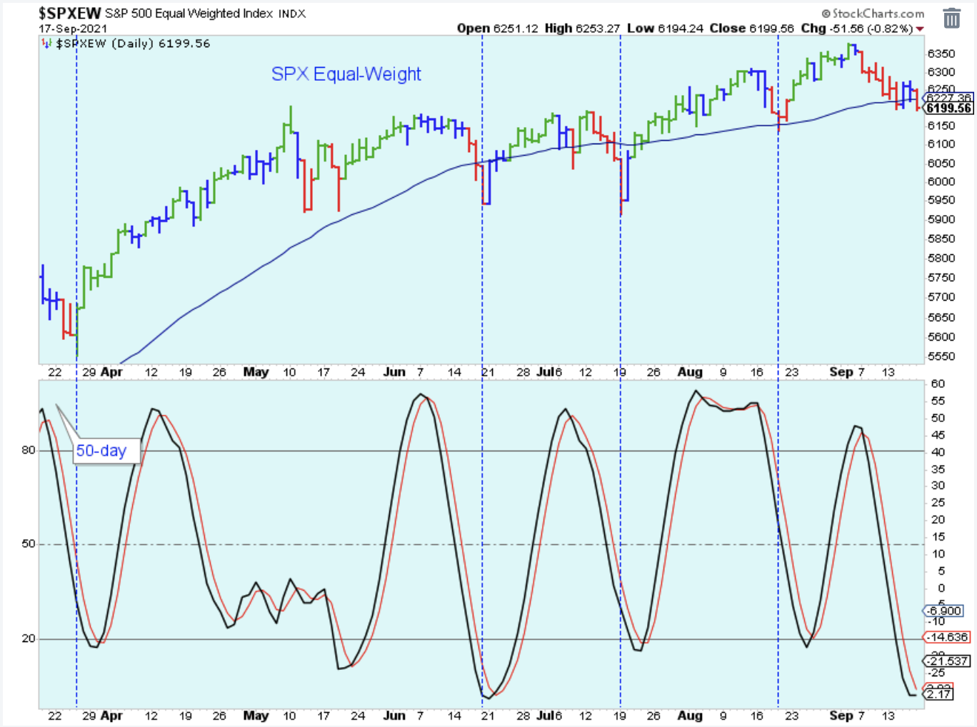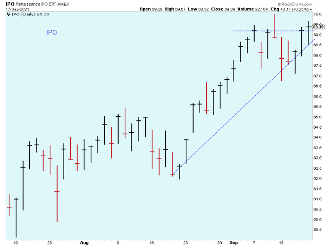 The SPX equal-weight closed just below its 50-day. This index doesn't look too bad, but it is important that it holds above the August low. Otherwise, the possibility of a larger correction will be in play.