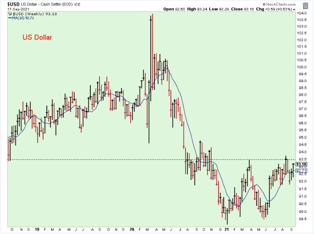 I'm watching the US dollar carefully. I think of a strong US dollar as being very helpful to US stock prices. On the other hand, a weak dollar tells me to consider purchasing emerging market and commodity-related stocks. At the moment, the weekly chart pattern looks like it really wants to break out into a new uptrend.