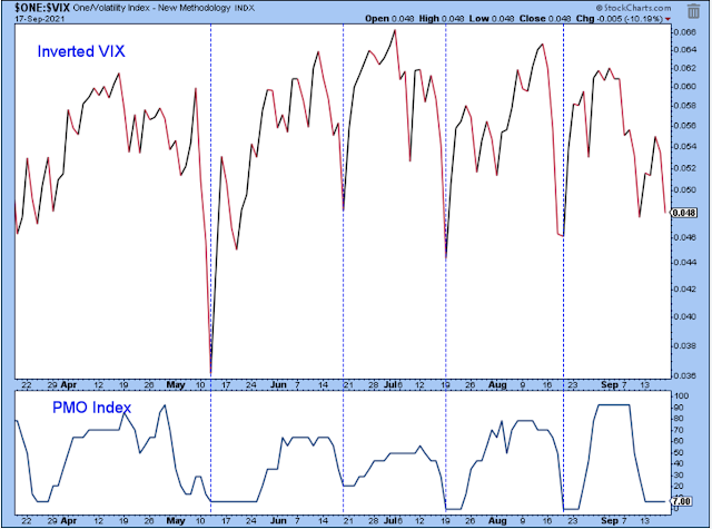 With the PMO near the low of its range, I'm on the lookout for a negative spike in the inverted VIX as a sign that the selling is done. I thought the negative spike occurred a few days ago, but the inverted VIX retested the level on Friday.