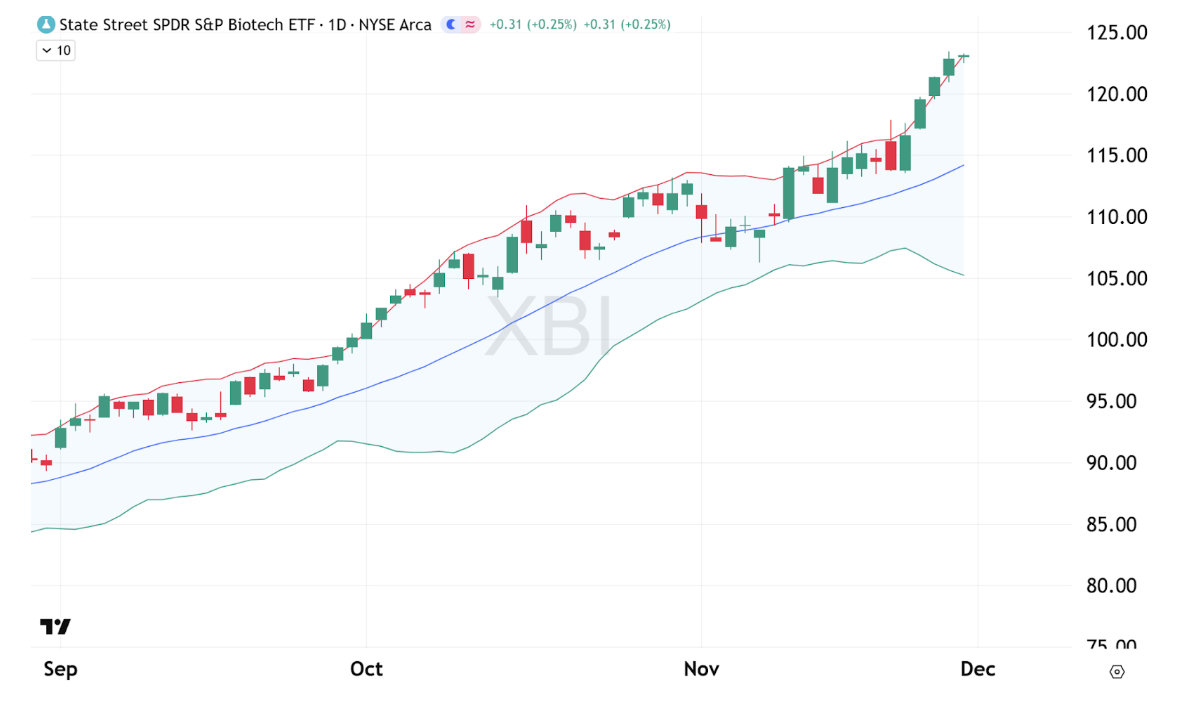 Biotech has exploded higher over the past week. XBI rallied from $107 to $123 in just four trading days. That's a 15% shift in a sector known for volatility, but this move came with a specific pattern that can create opportunities.