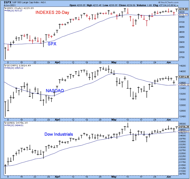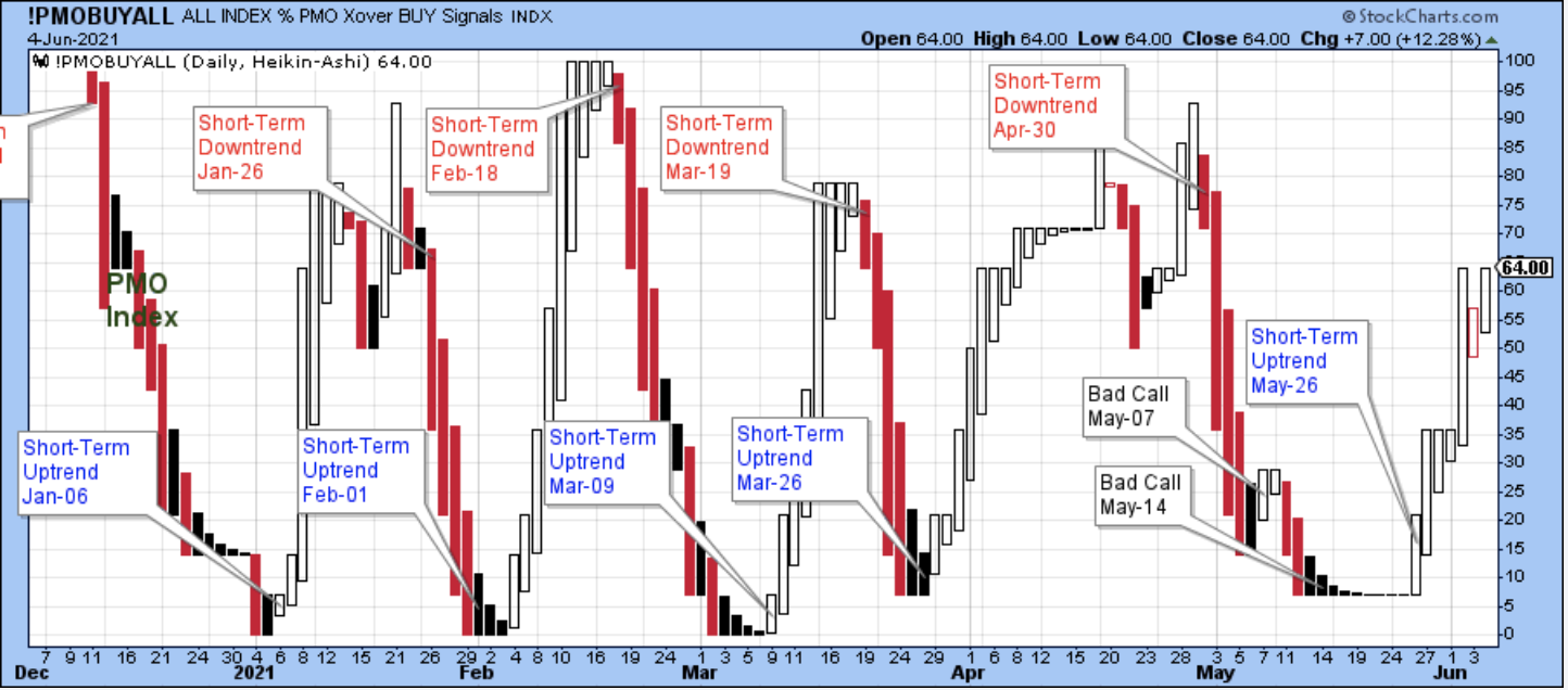 The PMO index started moving higher seven trading days ago, so I will label the uptrend as beginning on May 26. It hasn't really felt like the beginning of an uptrend, though. The major indexes have been out-of-sync and breakouts were not following through to the upside. However, Friday, June 4 was constructive for many stocks, so perhaps the general market uptrend is starting to come together for all the major indexes in the short-term.