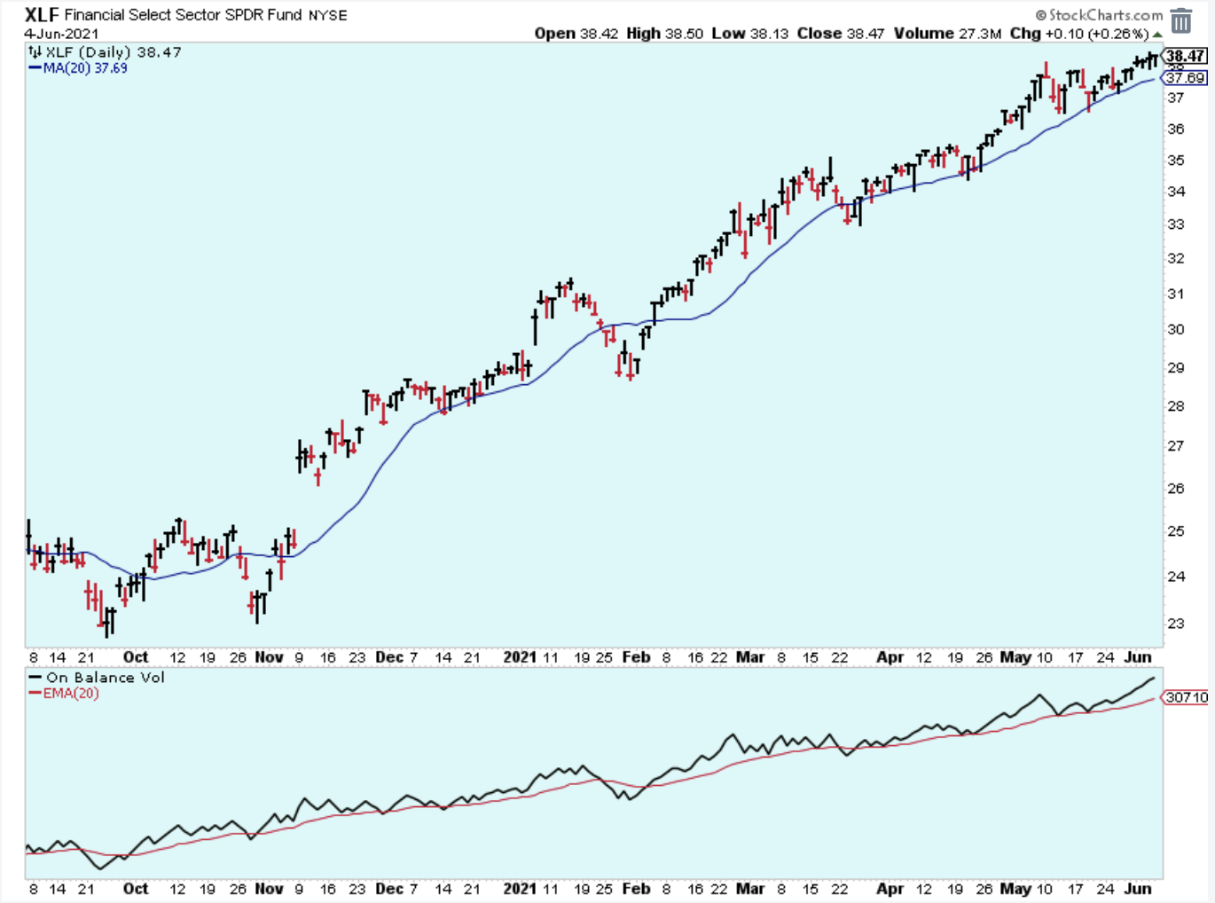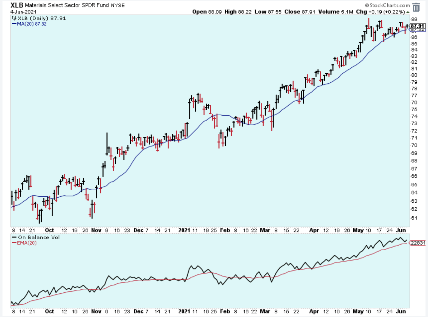 The materials took a break for a few weeks, but now look ready to move higher again. This index never closed below the 20-day during this consolidation. Very bullish.