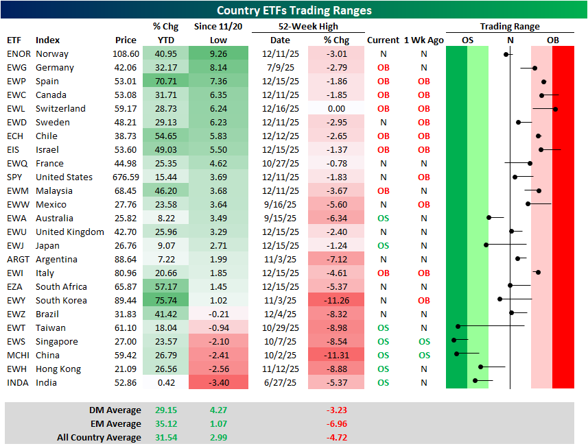 For a closer look at country-level performance, below we show 25 country ETFs. For each one, we highlight their performance year-to-date, since the recent low for US stocks on 11/20, the distance from and date of 52-week highs, and trading ranges. Again, the best performing equities in the past couple of weeks, since US stocks put in a low on 11/20, have been in Europe. Of those, Spain (EWP) has also been one of the best performers year to date with an over 70% gain. There is only one country listed that has outperformed that: South Korea (EWY). EWY has rallied over 75% this year, with those strong returns coming thanks in no small part to the AI trade, including memory stocks like SK Hynix. While South Korea has rallied massively year to date, it is also one of the countries furthest from 52-week highs (currently down 11.26%). Other Asian nations are also down more significantly from their respective 52-week highs, including China (MCHI), which, like South Korea, has fallen by double-digit percentages from its high. Given this, those same countries are now technically oversold, including some to extreme degrees.