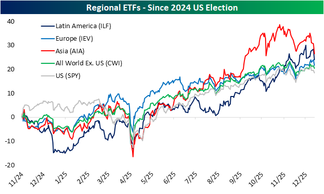 In a Chart of the Day from last month, as well as an update in Monday's Morning Lineup, we highlighted the strong performance of assets out of Chile. As shown below, Chile's strength comes in the context of broader recent regional strength in Latin America. Since the 2024 US election, the Latin America ETF (ILF) now ranks as the second strongest region of the world behind Asian equities (AIA). ILF has rallied 23.87% through today, but was up over 30% at the high on December 4th. Likewise, AIA has pulled back significantly since its high from the fall, including a lower low today. As Asian and Latin American stocks have pulled back recently, European stocks (IEV) have held up relatively better. That includes a fresh high being hit yesterday.