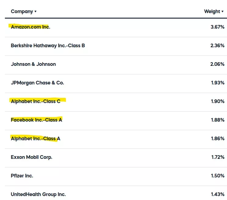 The Standard & Poor's 500 Index had 10 sectors for a long time, and, since 2015, it has had 11 with the addition of Real Estate. The very largest sectors are Information Technology at 32.5%, Financials at 13.1%, Communications Services at 108% and Consumer Discretionary at 10.4%, according to State Street, which oversees SPY. SPY has dropped in price by 0.6% as of 2/5, and Vanguard S&P 500 ETF (VOO) has dropped the same.