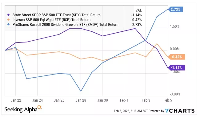16 days ago, I wrote an article about ETFs that I thought could handle a big problem that many investors may be facing with the extreme run-up in a few large-cap stocks over the past three years. I suggested two ETFs here that would help diversify equity portfolios, RSP and SMDV. The ideas were very different, as RSP, the Invesco S&P 500 Equal Weight ETF, holds all of the S&P 500 names but weights them equally rather than by market cap. SMDV, the Invesco S&P 500 Equal Weight ETF, holds 104 high quality smaller names. Here is how State Street SPDR S&P 500 ETF Trust/ State Street (SPY) has done relative to these two since the close of business on 1/21: