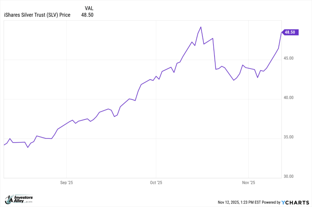 The precious metal silver has been red hot, up 71% over the last year. The iShares Silver Trust (SLV) has gained 42% in the previous three months. A 10% drop in late October was short-lived.
