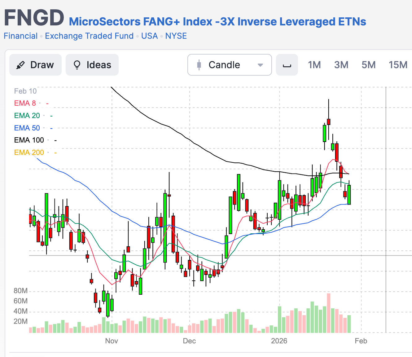 Keep an eye on the FNGD… It’s above its 50-day moving average still… and that’s an issue when more stocks are in breakdown mode than in breakout mode.