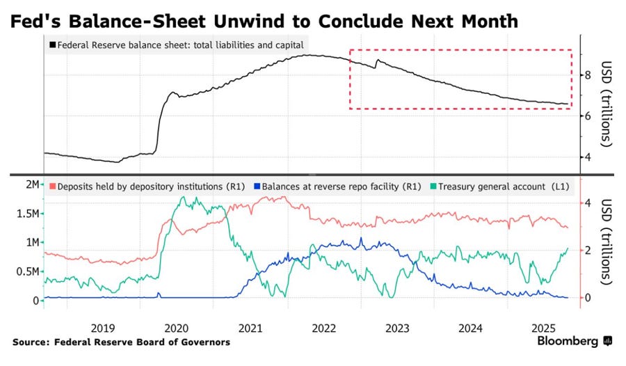 More importantly, the Fed announced that quantitative tightening (QT), its balance-sheet runoff operation, will stop on December 1.