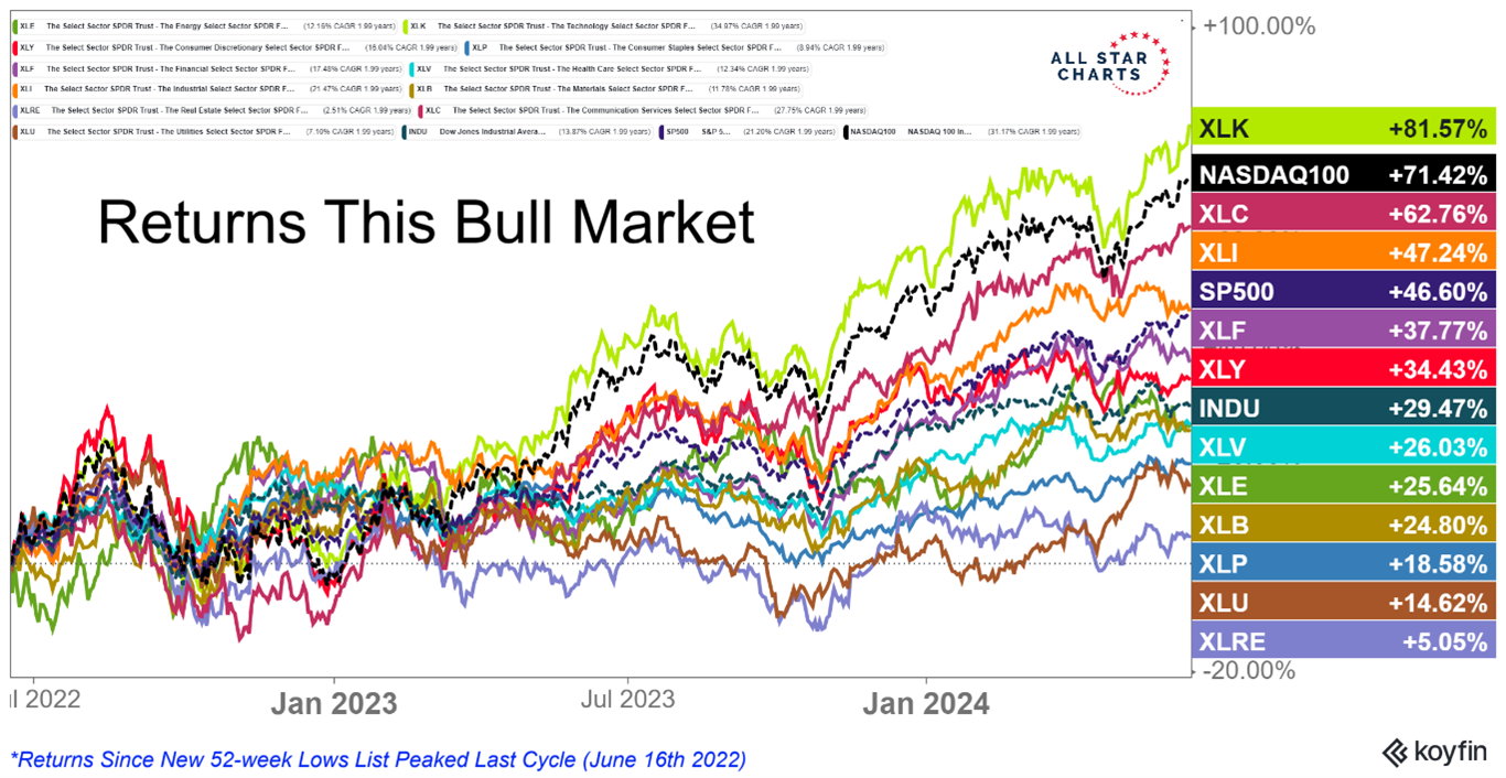 These are the types of sectors you would expect to see leading during bull markets. More defensive areas like Real Estate, Utilities, and Consumer Staples underperforming is also perfectly consistent with other bull markets from the past.