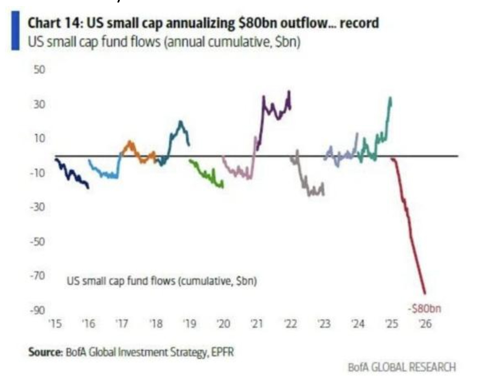 Elsewhere, let's turn our attention to where the money isn't going. It is decisively not flowing into the Russell 2000. Small-cap stocks here are annualizing an $80 billion exodus this year. That’s the biggest exit of all time.