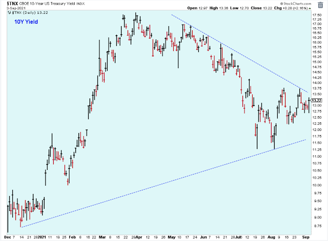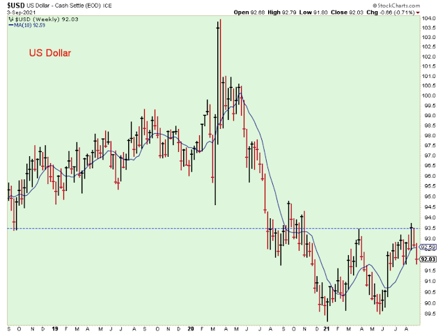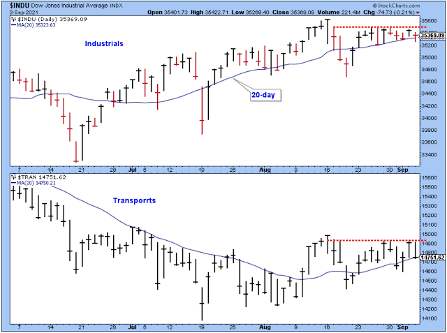 It is hard to find a bearish chart in my chart lists, but not all of them are clearly bullish. This chart below is a bit disappointing because it shows that neither of the Dow indexes has rallied very well. Both indexes had sharp rallies in early August so maybe they are still consolidating gains. The transports were quite weak on Friday, which is probably because of the disappointing job number.